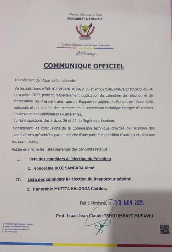 Sous la présidence du Professeur Isaac Jean Claude Tshilumbayi Musawu, le bureau de l’Assemblée nationale vient de publier un communiqué ce 10 novembre 2025 — qui marquera les esprits. Non pas comme un symbole de transparence, mais comme un coup porté à la démocratie parlementaire congolaise.
