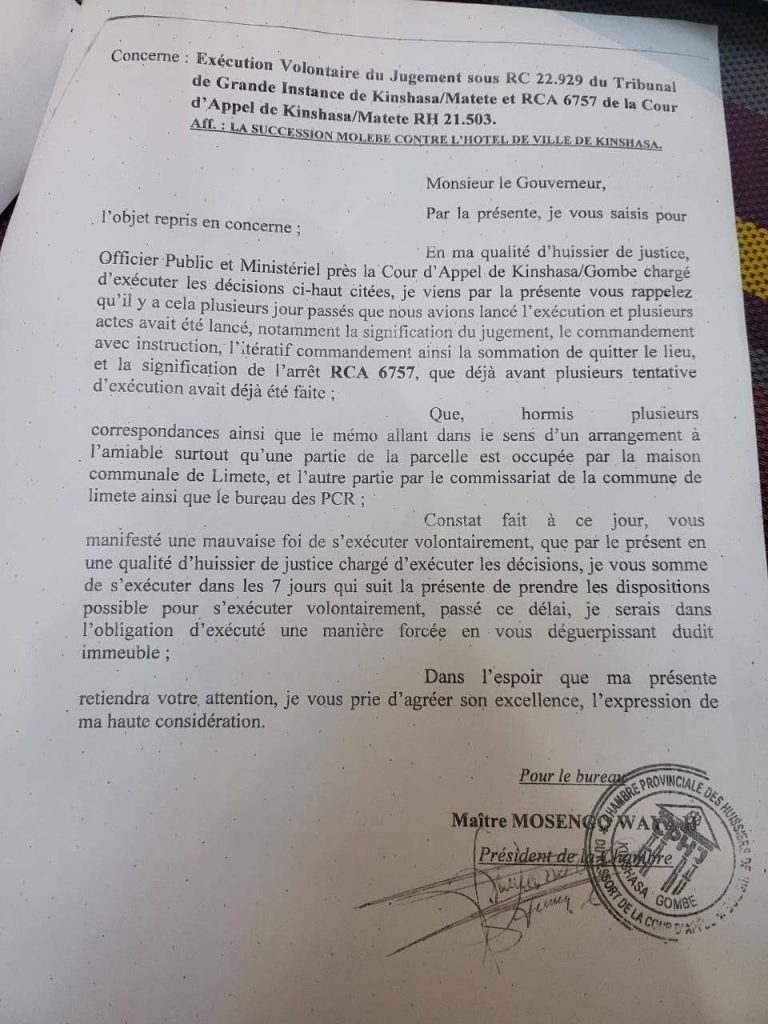 Selon ces décisions, la justice a tranché en faveur de la succession Molebe dans le litige l’opposant à l’hôtel de ville de Kinshasa. En conséquence, les autorités de la commune de Limete sont contraintes de libérer les installations qu’elles occupent actuellement.