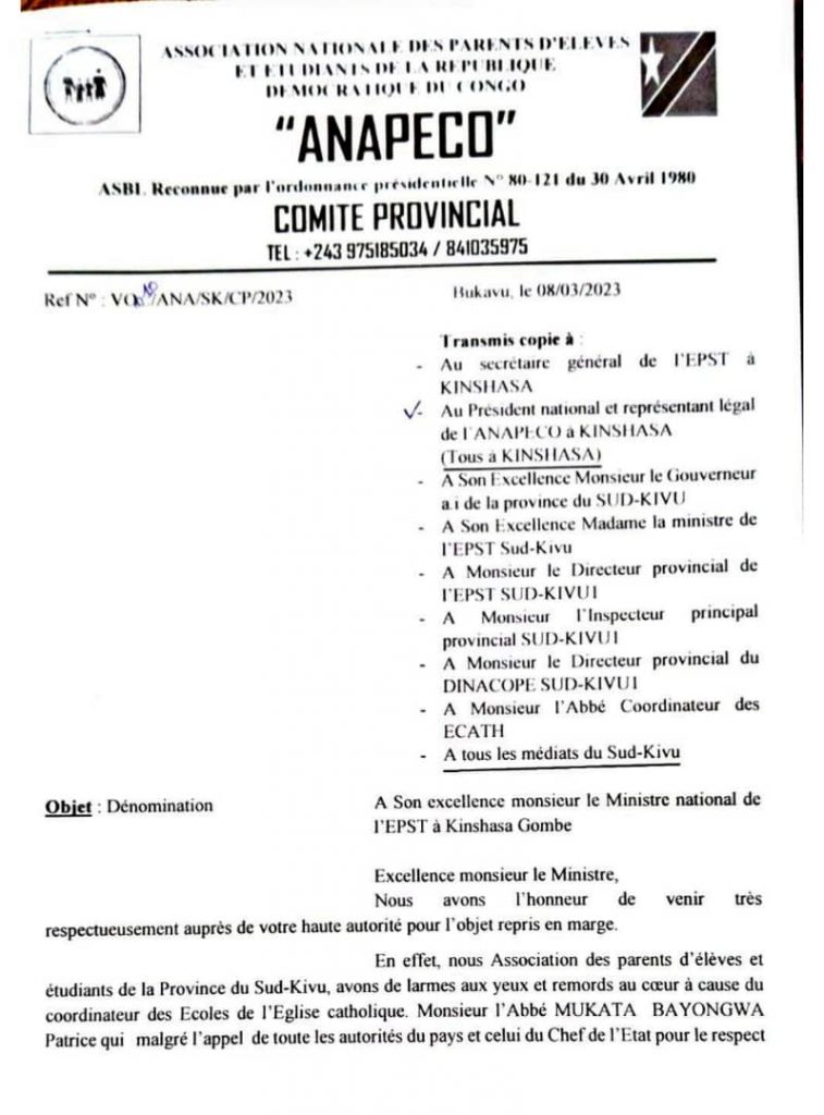 A cet effet, le Comité Provincial de l’Association Nationale des Parents d’Élèves et d’Étudiants de la RDC, ANAPECO, vient de saisir le Ministre de l’EPST Tony Mwaba Kazadi pour dénoncer la cupidité et la course effrénée au lucre de Monsieur l’Abbé Mukata Bayongwa Patrice, Coordinateur provincial des Écoles conventionnées catholiques du Sud-Kivu, en violation des dispositions constitutionnelles relatives au caractère gratuit et obligatoire de l’enseignement primaire dans les établissements publics.