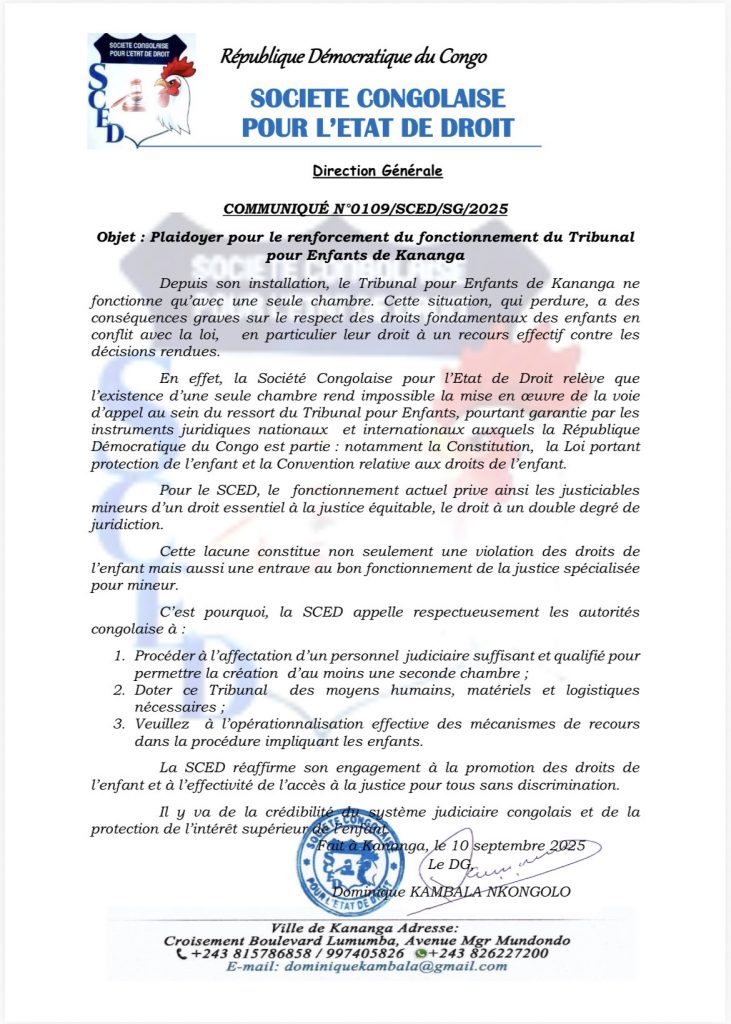 La Société Congolaise pour l’État de Droit (SCED) a lancé, ce 10 septembre 2025, un appel pressant aux autorités congolaises en faveur du renforcement du fonctionnement du Tribunal pour Enfants de Kananga. Depuis son installation, cette juridiction spécialisée ne dispose que d’une seule chambre, une situation jugée préoccupante par l’organisation.