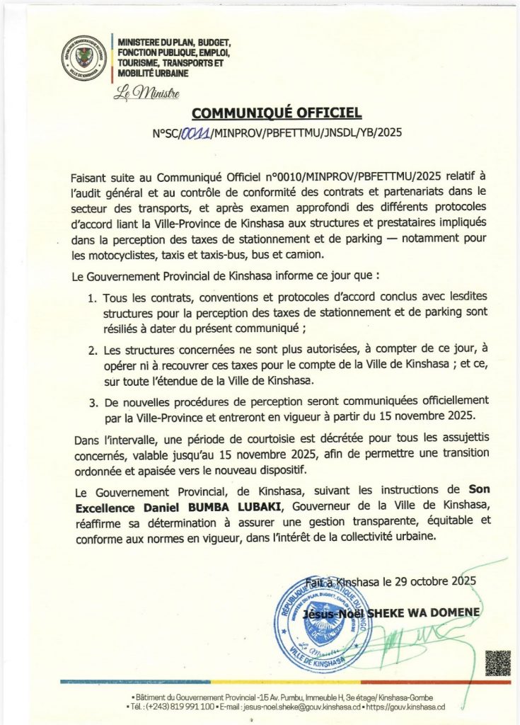 Le Gouvernement provincial de Kinshasa a annoncé, dans un communiqué officiel signé le 29 octobre 2025 par le ministre Jésus-Noël Sheke wa Domene, la résiliation immédiate de tous les contrats, conventions et protocoles conclus avec les structures chargées de la perception des taxes de stationnement et de parking dans la capitale.