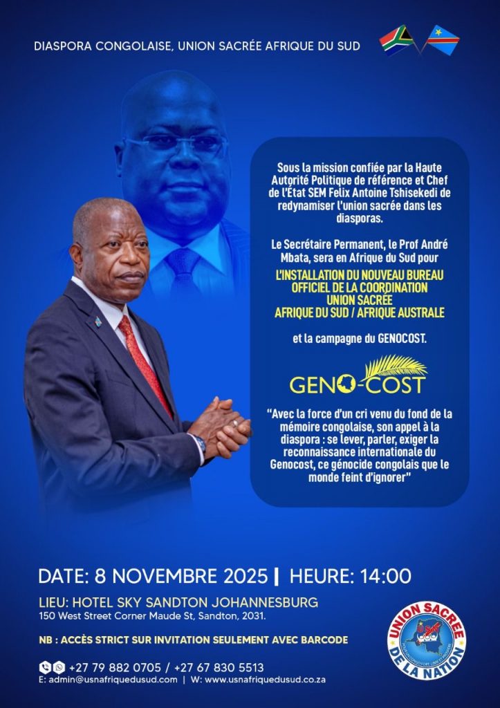 Dans ce même esprit de mémoire et de résilience, le professeur André Mbata, figure politique et intellectuelle engagée, sera présent le 8 novembre prochain à Johannesburg, en Afrique du Sud, pour commémorer le Genocost aux côtés de la diaspora congolaise.