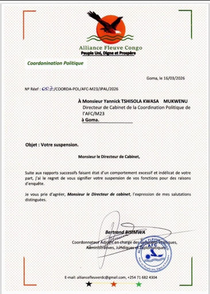 Pour couvrir cela, ils avancent des raisons fallacieuses que »le Directeur de cabinet de Corneil Nangaa est suspendu de ses fonctions par l »Afc-M23 suite aux rapports successifs faisant état de comportement excessif et indélicat ». Ils avancent que »Yannick Tshisola est en prison depuis deux jours pour tentative de viol. Sa victime, une certaine Solange, femme de manage, l’accuse d’avoir voulu abuser d’elle sexuellement dans son bureau alors qu’elle faisait son travail. » Ce que ne peut faire cet homme très averti qui sait que toutes les femmes de ménage, Rwandaises d’origine ne sont que des espionnes de Kagame et en conséquence, il ne peut se livrer à cet exercice au risque de sa vie.