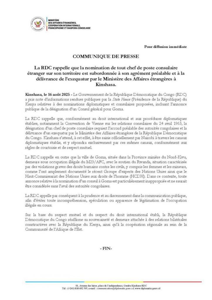 Dans un communiqué officiel, les autorités congolaises ont rappelé que, conformément à la Convention de Vienne de 1963, la nomination d’un chef de poste consulaire étranger nécessite un agrément formel et la délivrance d’un exequatur par le ministère congolais des Affaires étrangères. Kinshasa a ainsi pris ses distances avec l’annonce venue de Nairobi, soulignant que cette démarche n’a pas été validée par les instances compétentes de la RDC.