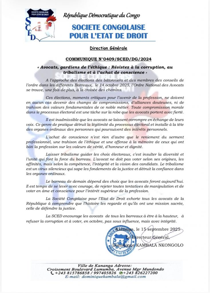 À l’approche des élections des bâtonniers et des conseils de l’ordre prévues le 14 octobre 2025, la Société Congolaise pour l’État de Droit (SCED) exhorte les avocats à faire preuve d’intégrité et à protéger les valeurs fondamentales de leur profession.