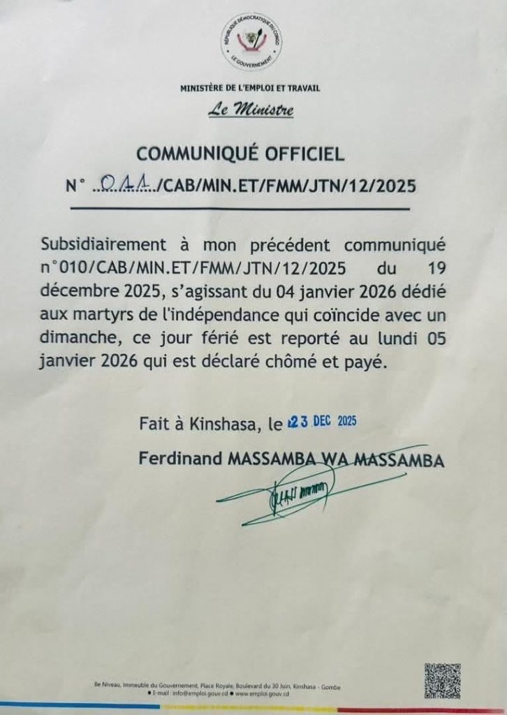 Le communiqué a été signé à Kinshasa, le 23 décembre 2025, réaffirmant l’engagement du gouvernement à la protection des droits des travailleurs et à la préservation de la mémoire nationale.