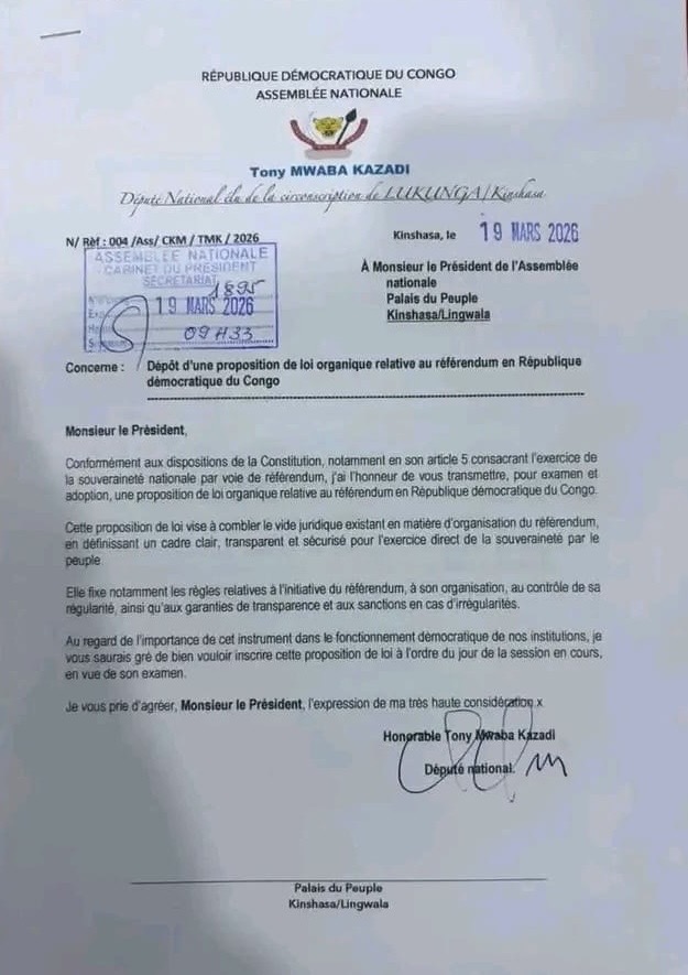 Le député national Tony Mwaba Kazadi a officiellement déposé, ce mercredi 19 mars 2026, une proposition de loi organique relative à l’organisation du référendum en République démocratique du Congo.