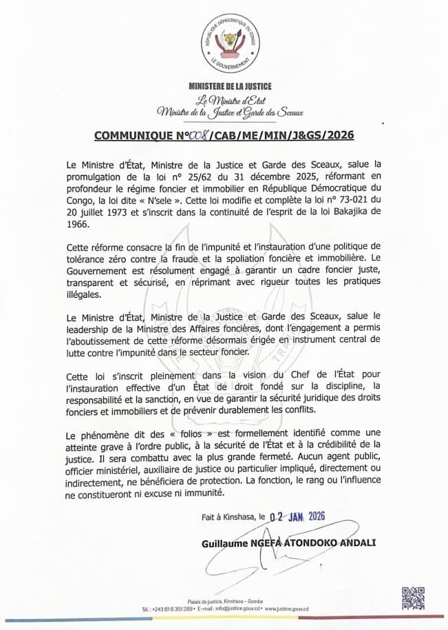 Fait à Kinshasa, le 02 janvier 2026, ce communiqué marque une volonté politique claire de restaurer l’autorité de l’État et de mettre fin aux dérives longtemps décriées dans le secteur foncier en République démocratique du Congo.